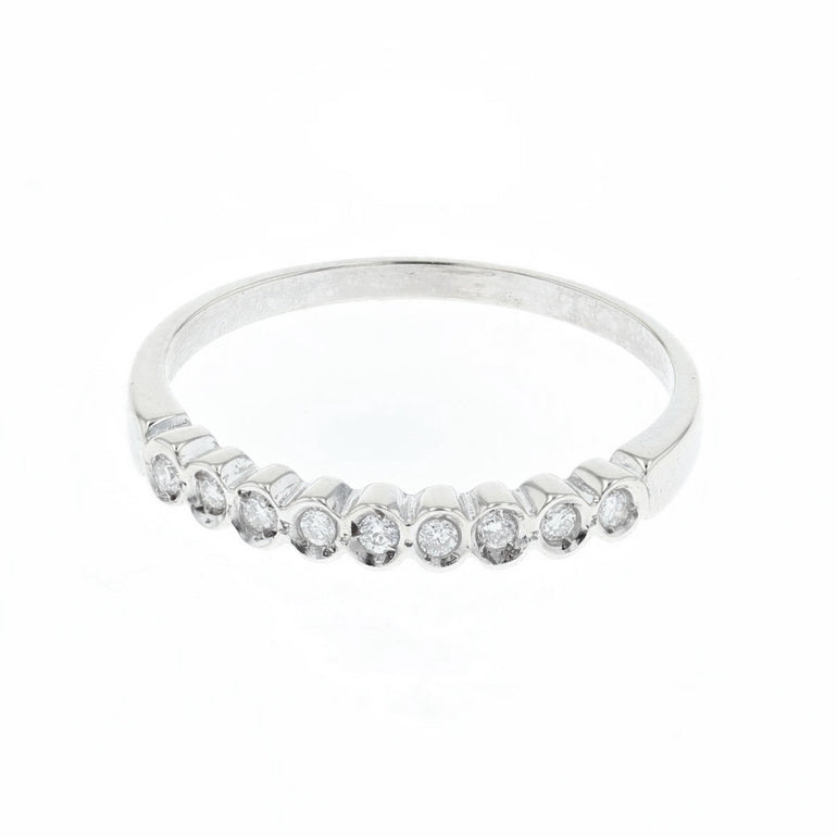This stunning 0.10ct/tw diamond band is crafted from 18K white gold and features 0.10ct/tw of brilliant cut diamonds of I clairty and G color set in a bezel illusion fashion. This highly sought-after combination lends classic sophistication to any jewelry collection.