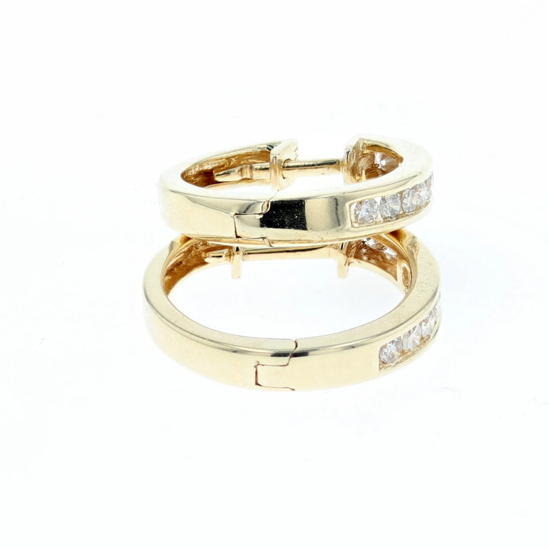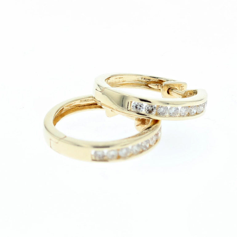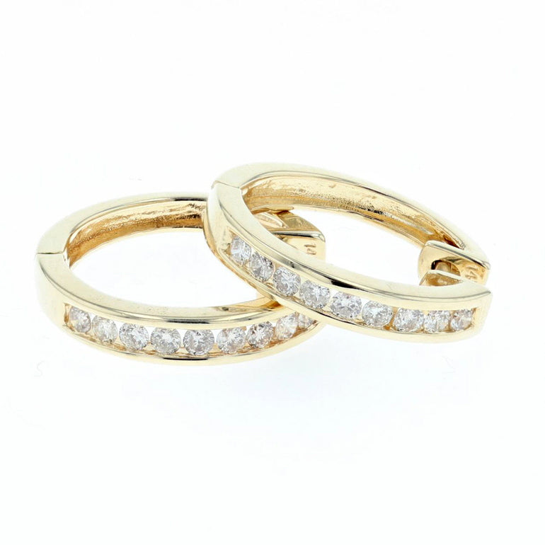 Our diamond huggie earrings feature 0.40ct/tw of brilliant cut diamonds in SI clarity and G color, set in a channel fashion on 14K yellow gold. Their classic design and sparkle will elevate your look for any occasion.