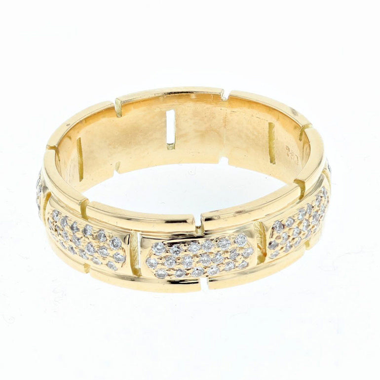 This 18k yellow gold wedding band features 7 sections of diamonds totaling 1 carat (ct). The diamonds are of VS clarity and F-G color, making them sure to shine on your special day. With its stylish design and high-quality diamonds, this ring is the perfect choice to mark life's most important moments.