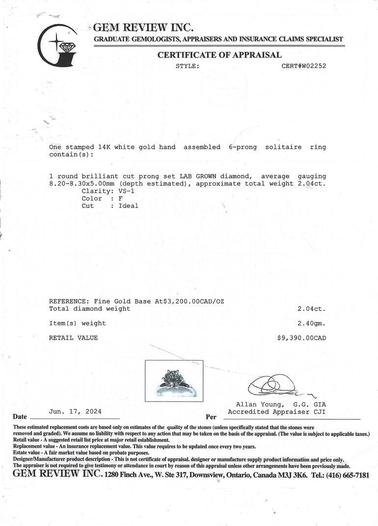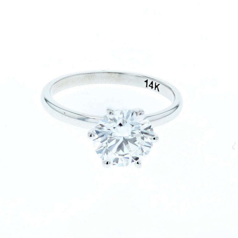 Discover the brilliance and beauty of this 14k white gold lab grown diamond engagement ring. Featuring a stunning 2.04ct brilliant cut CVD diamond of VS1 clarity and F color, this ring is the perfect choice for a lasting and ethical symbol of your love. Set in a classic 6 prong fashion, it radiates elegance and sophistication.