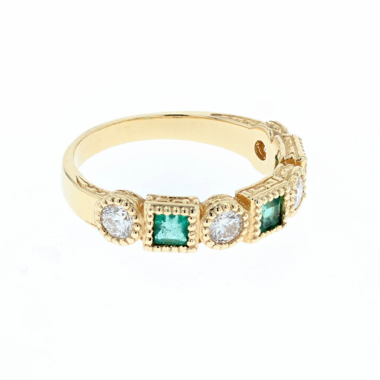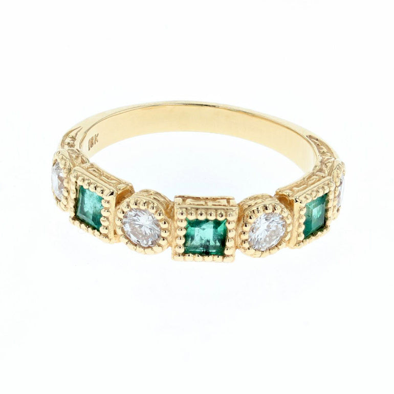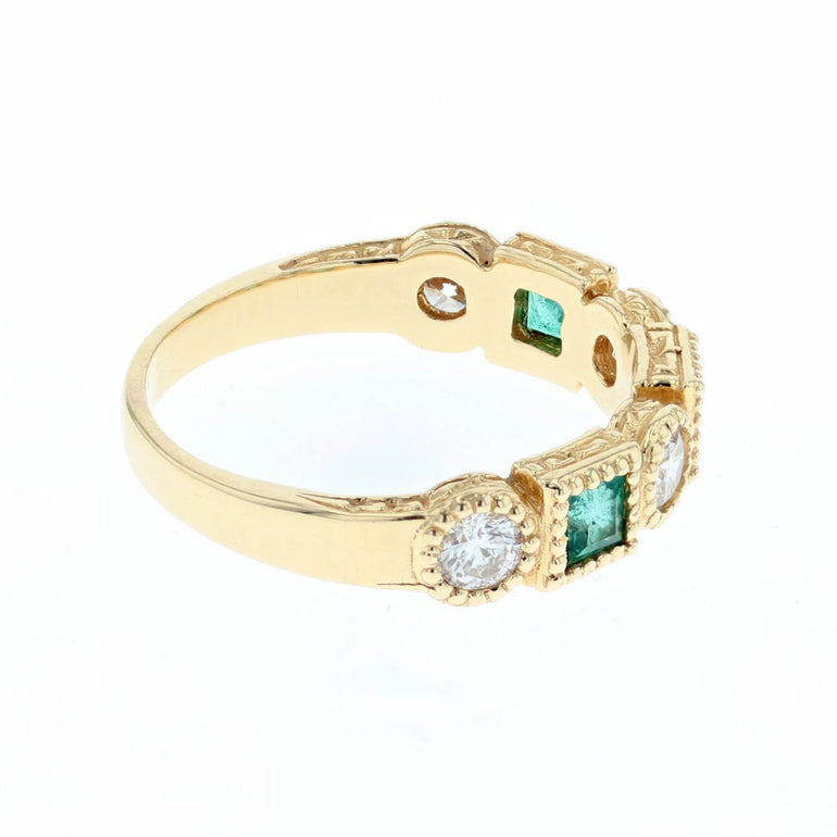 This 18K Yellow Gold Ring is a stunning addition to any jewelry collection. Featuring 0.60ct/tw of brilliant cut diamonds with VS clarity and G color, and 0.60ct/tw of square cut emeralds for added sparkle, this piece is sure to dazzle. The millgrain finish adds an intricately detailed look.