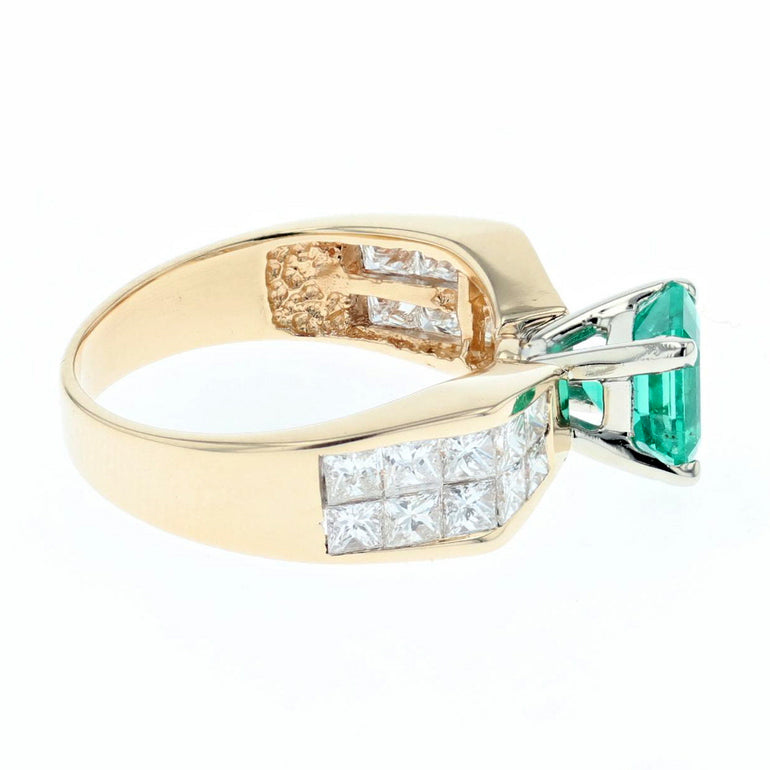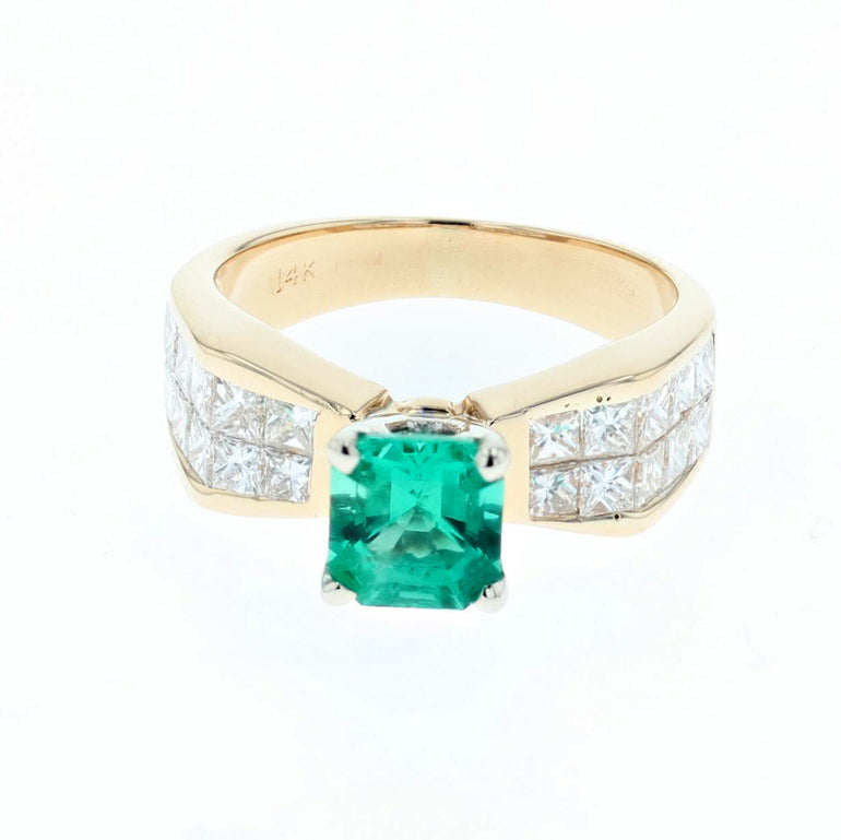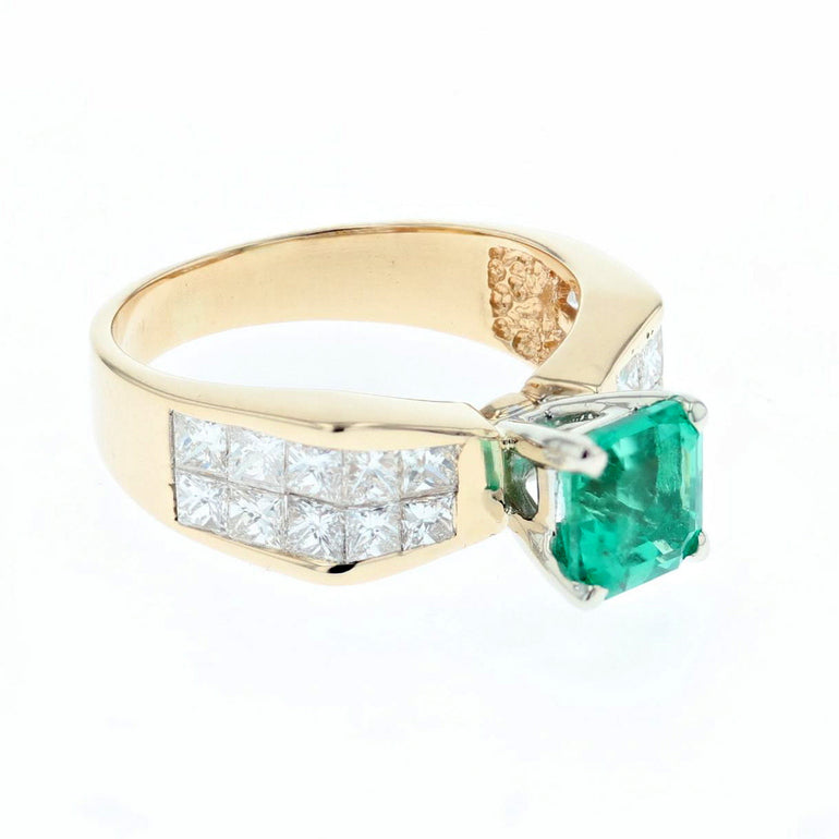 This stunning emerald and diamond ring is crafted in 14K yellow gold. Featuring a vivid green 1.07ct emerald and 2.5ct/tw invisible set princess cut diamonds of VS clarity and G color, this ring exudes elegance and luxury. Perfect for adding a pop of color to any outfit.