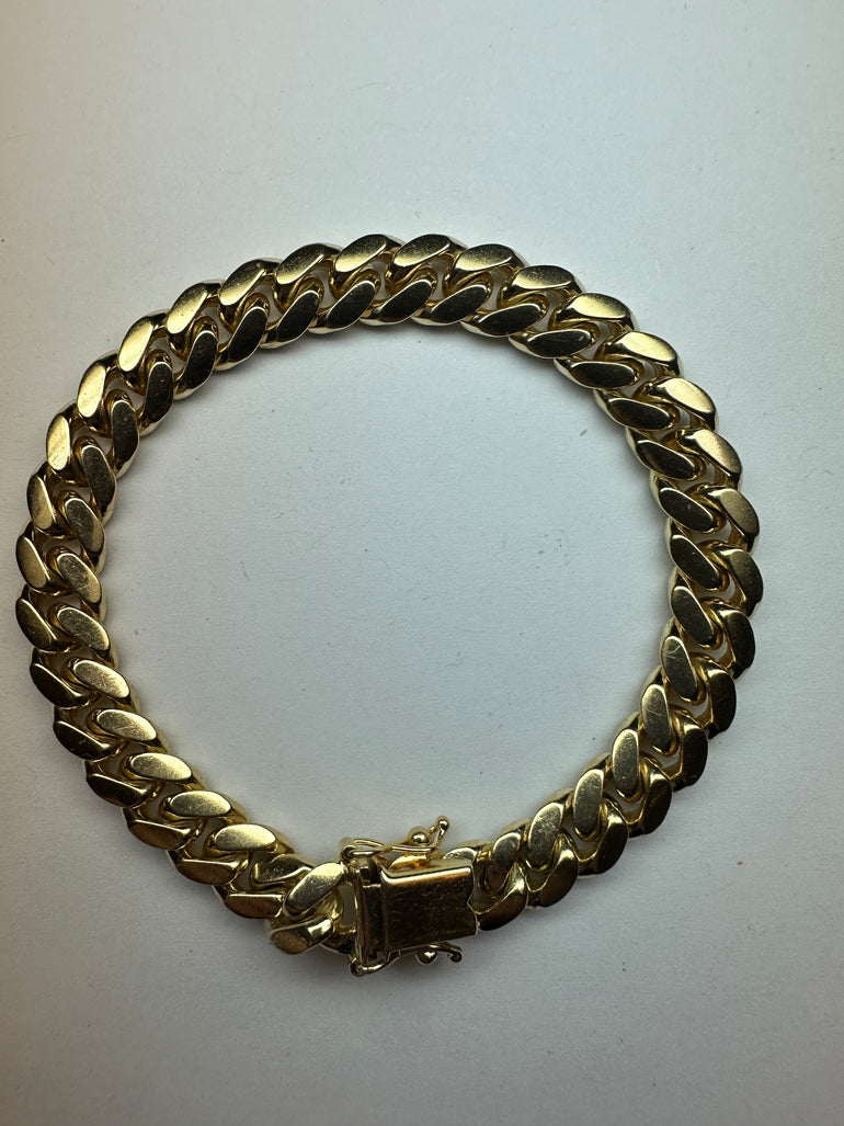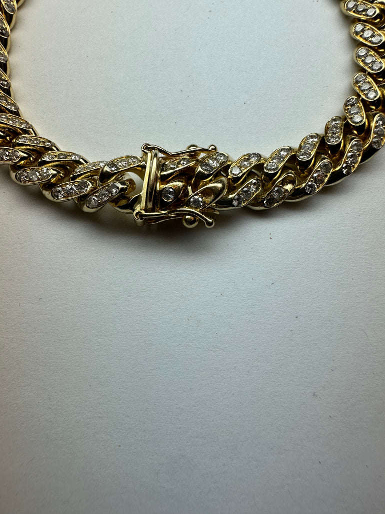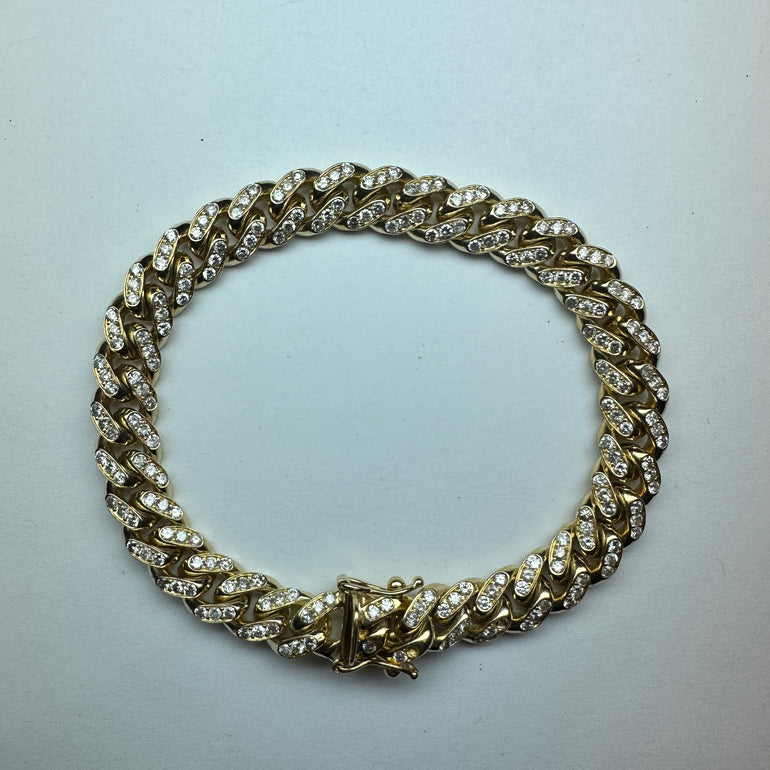 This stunning 8-inch long, 31-gram bracelet featuring 3 carats of natural diamonds set in 10 karat yellow gold. The iconic Cuban link chain adds a touch of luxury to any outfit.